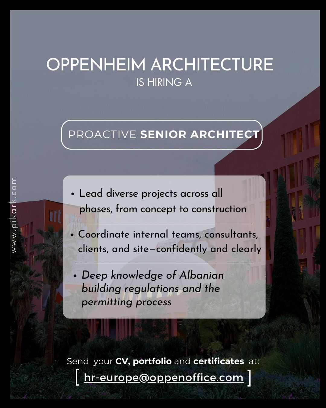 Our team of Oppenheim Architecture Tirana is looking for a Senior Architect (+7 years) who takes full ownership — leading projects from the first sketch to the final handover, navigating Albanian codes and permitting with confidence, and providing clarity to clients, consultants, and teams alike
