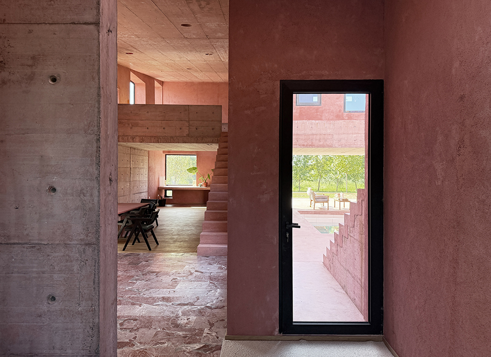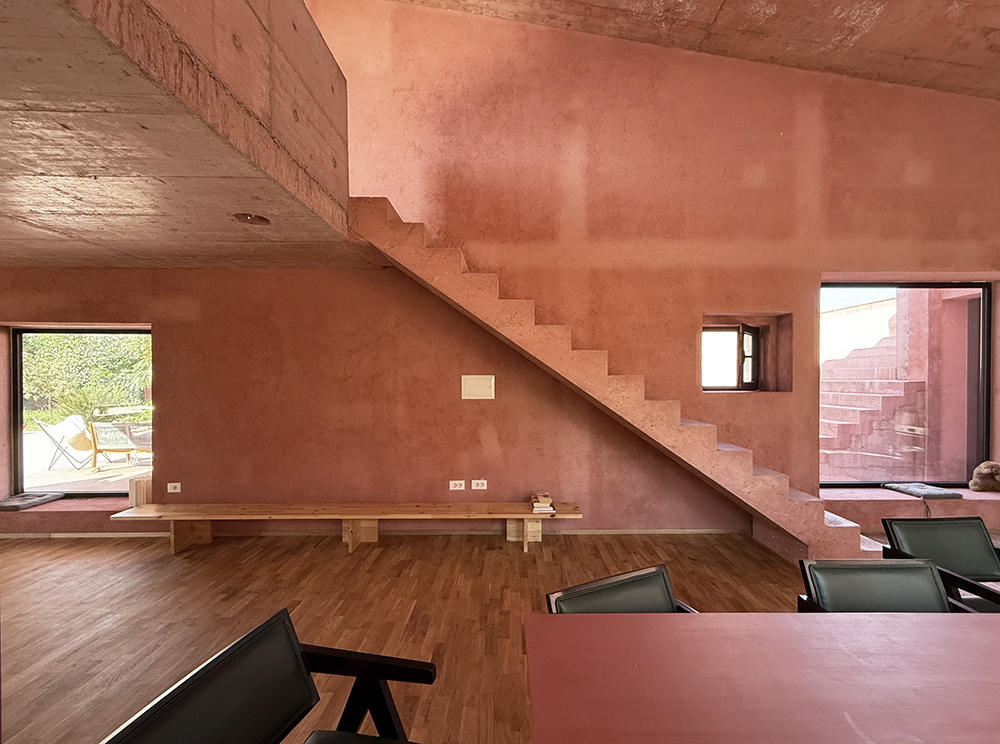 The floors are made of local pinkish marble and wood. We purchased casein from nearby farms and produced our own lime. The construction generated almost no waste. Large fixed windows frame the views and bring in light, while only small windows open for natural ventilation. Local teams of four to five workers built the house, which was simplified as much as possible to increase usable space and reduce the cost of expensive amenities.