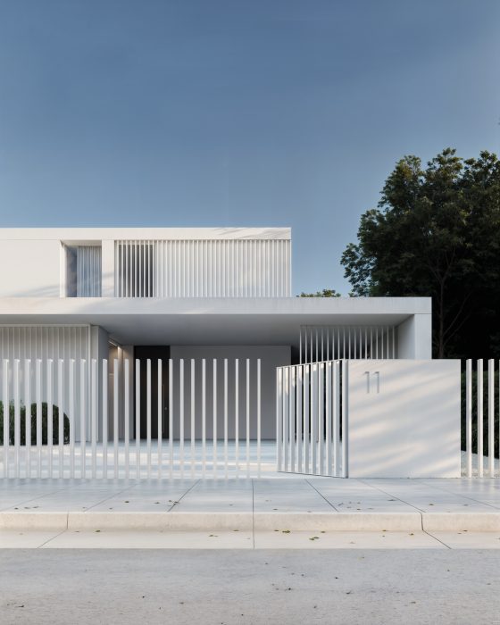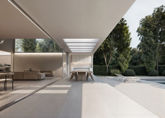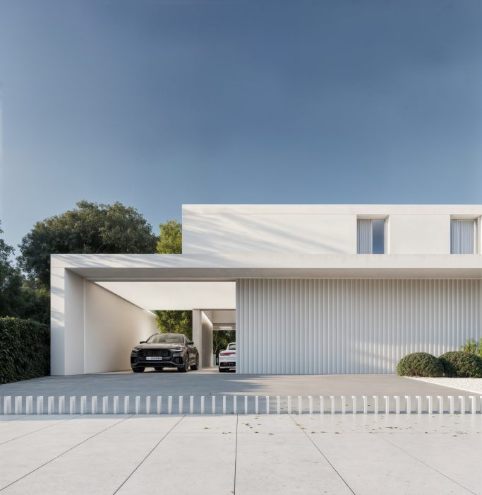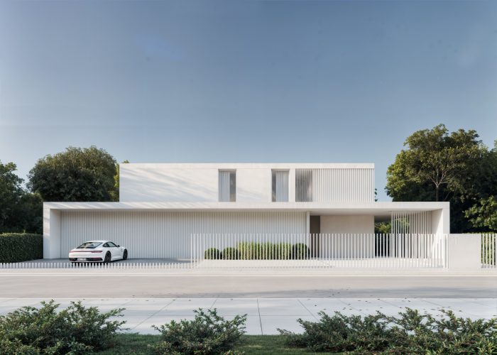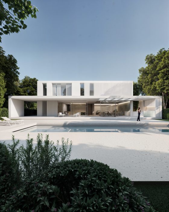 "Një vilë moderne e projektuar me një estetikë të qetë dhe minimaliste, duke theksuar linjat e pastra, dritën natyrale dhe integrimin e përsosur me peizazhin përreth. Dizajni i jep përparësi qartësisë hapësinore, elegancës së përmbajtur dhe një ekuilibri harmonik midis formës dhe funksionit."