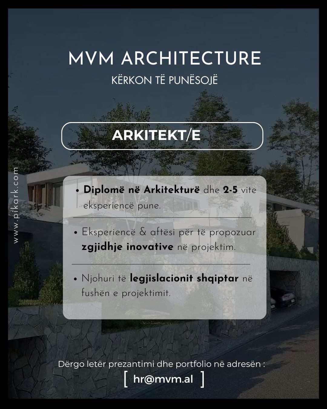 MVM Architecture, Construction and Development kërkon të punësojë një Arkitekt me 2-5 vite eksperiencë.